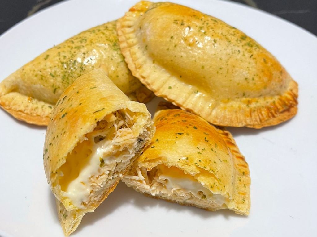 Pré-aqueça o forno a 180-200°C. Abra a massa em superfície enfarinhada com rolo até ficar fina (cerca de 3-4mm). Corte círculos ou retângulos com cortador ou copo (tamanho médio 10-12cm). Coloque uma colher generosa de recheio no centro, dobre ao meio, feche as bordas pressionando com garfo para selar bem (pincele as bordas com água se precisar grudar).